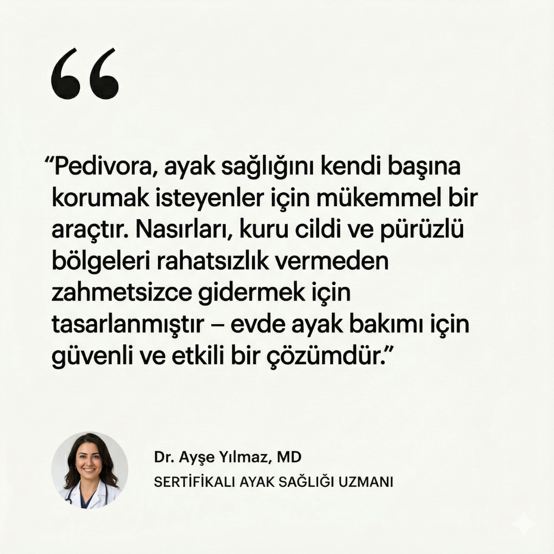 Pedivora, ölü deriyi dakikalar içinde nazikçe temizleyerek ayaklarınıza bebeksi yumuşaklığını geri kazandırır. Pahalı randevulara gerek kalmadan, evinizin konforunda bu değişimi başlatın.